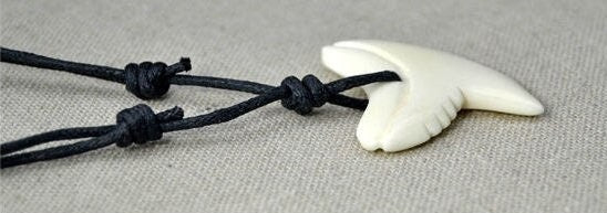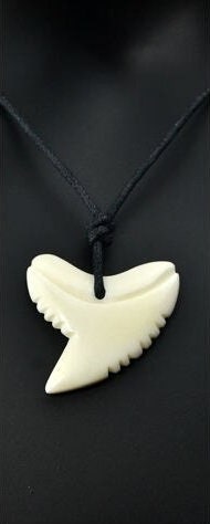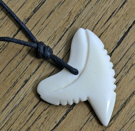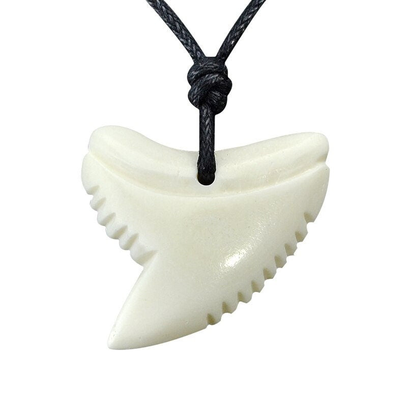 Dieser atemberaubende Haifischzahn-Anhänger ist handgeschnitzt aus echtem, ethisch einwandfreiem Yakknochen.