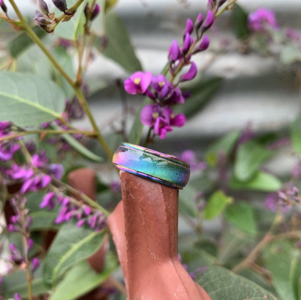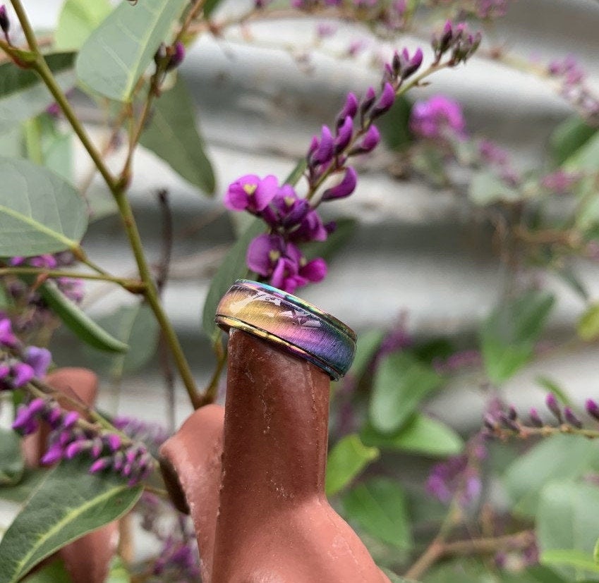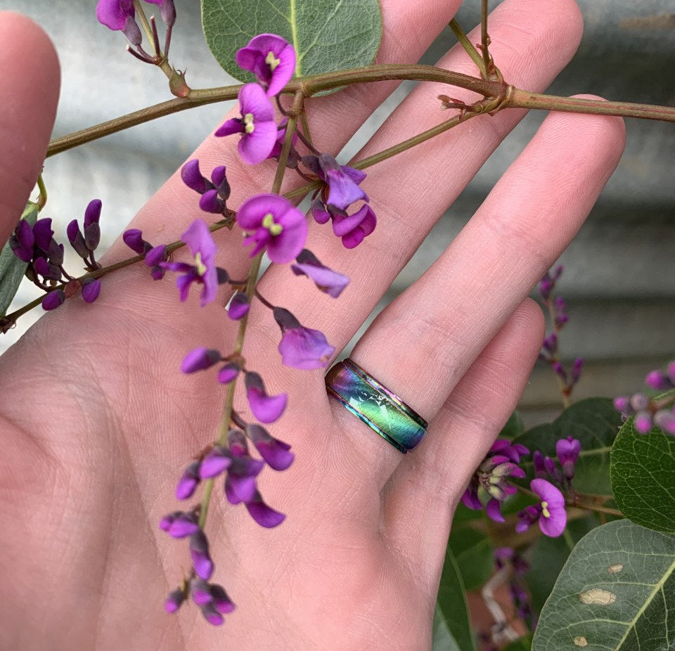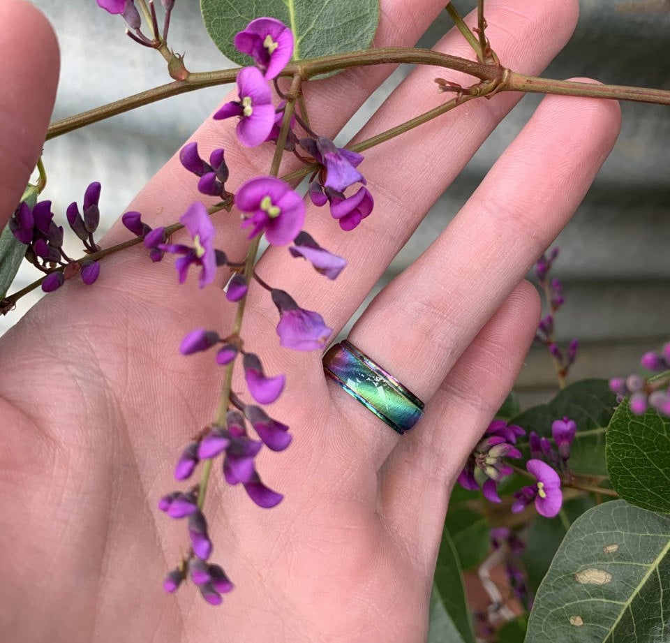 Dieser atemberaubende Ring ist mit einem farbverändernden faseroptischen Ulexit-Edelstein eingelegt, der auch als „Katzenauge“ bekannt ist. Ulexite besteht aus gesponnenen Glasfasern, die einen erstaunlichen Lichtbrechungseffekt erzeugen, der den Ring bei Bewegung schimmern und seine Farbe ändern lässt. Die Ringschiene wurde außerdem mit Titan behandelt, um ihr eine wunderschöne metallische Regenbogenfärbung zu verleihen.