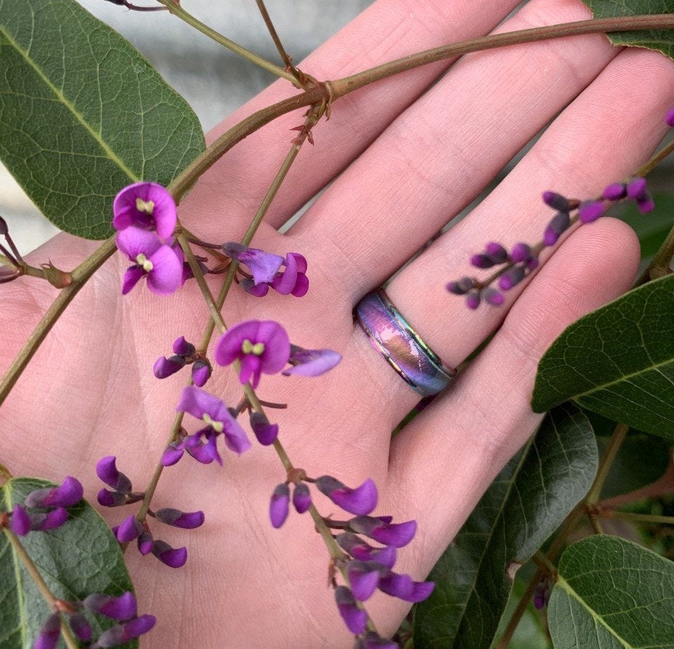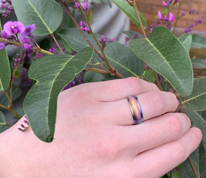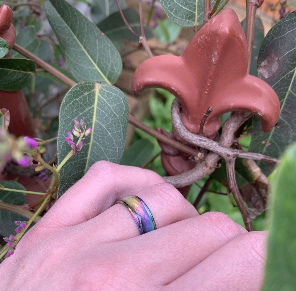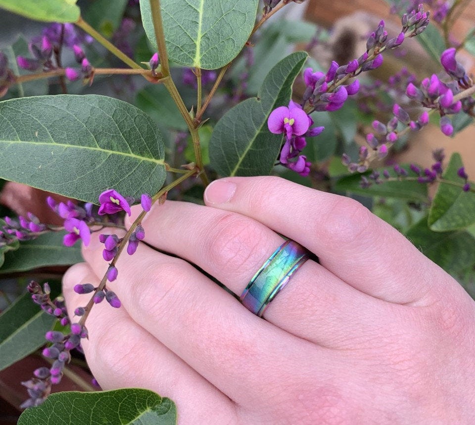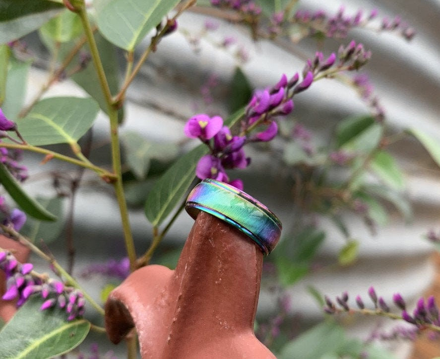 Dieser atemberaubende Ring ist mit einem farbverändernden faseroptischen Ulexit-Edelstein eingelegt, der auch als „Katzenauge“ bekannt ist. Ulexite besteht aus gesponnenen Glasfasern, die einen erstaunlichen Lichtbrechungseffekt erzeugen, der den Ring bei Bewegung schimmern und seine Farbe ändern lässt. Die Ringschiene wurde außerdem mit Titan behandelt, um ihr eine wunderschöne metallische Regenbogenfärbung zu verleihen.