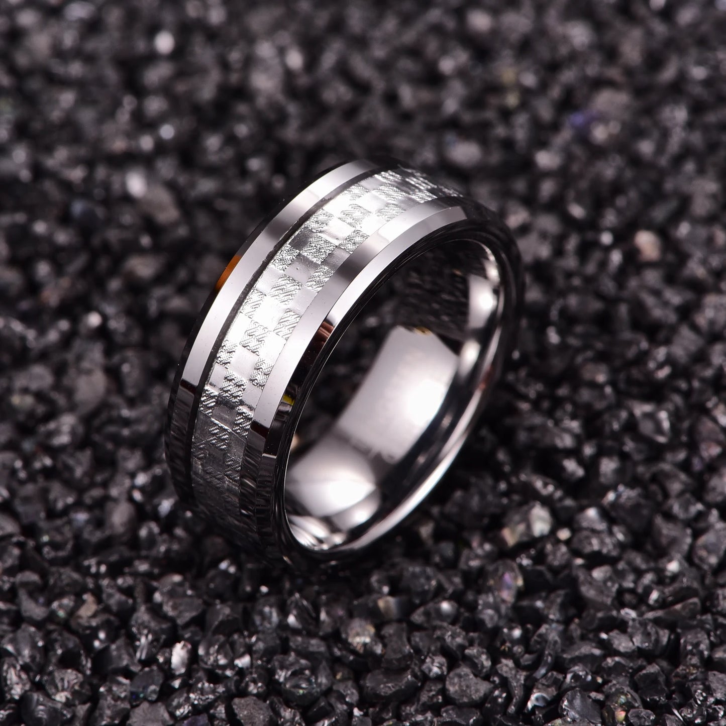 Un superbe bracelet en tungstène pour homme avec des bords biseautés masculins et une incrustation argentée à carreaux métalliques !