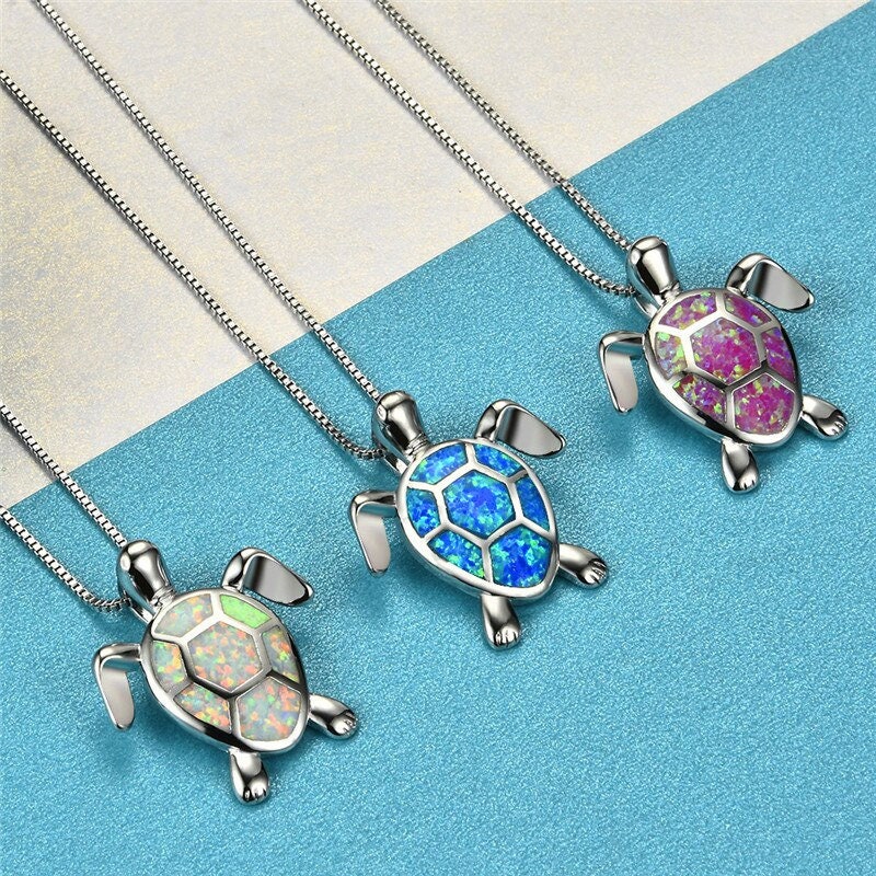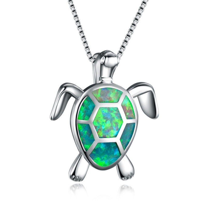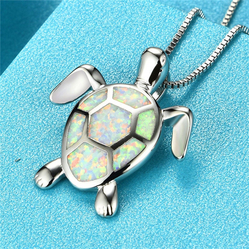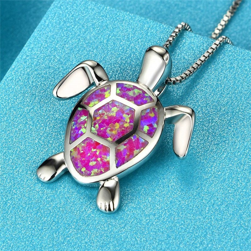 Ce magnifique pendentif tortue de mer est incrusté d'une magnifique opale de feu, qui clignote dans un superbe kaléidoscope de couleurs lorsque la lumière le frappe !