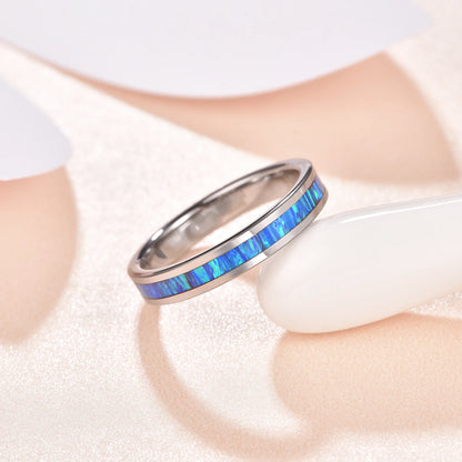 This blue opal ring captures the rhythm of the sea—fluid, vibrant, and ever-shifting. Crafted in a 4mm width, its polished silver Tungsten band holds a glimmering inlay of natural blue opal, echoing the sunlit surface of tropical waters. Swirls of oceanic green and deep sapphire flicker with every movement, like sunlight caught in rolling waves.