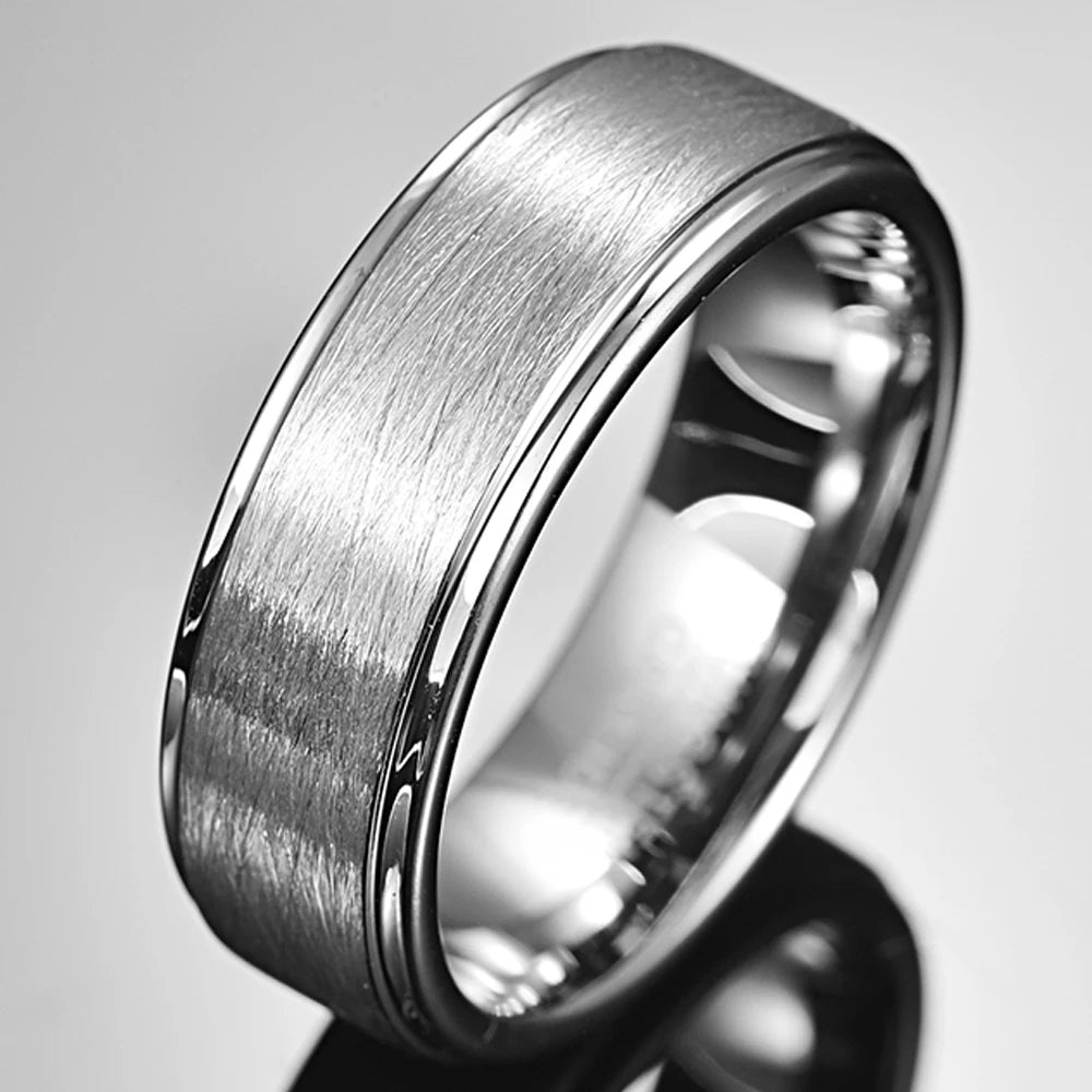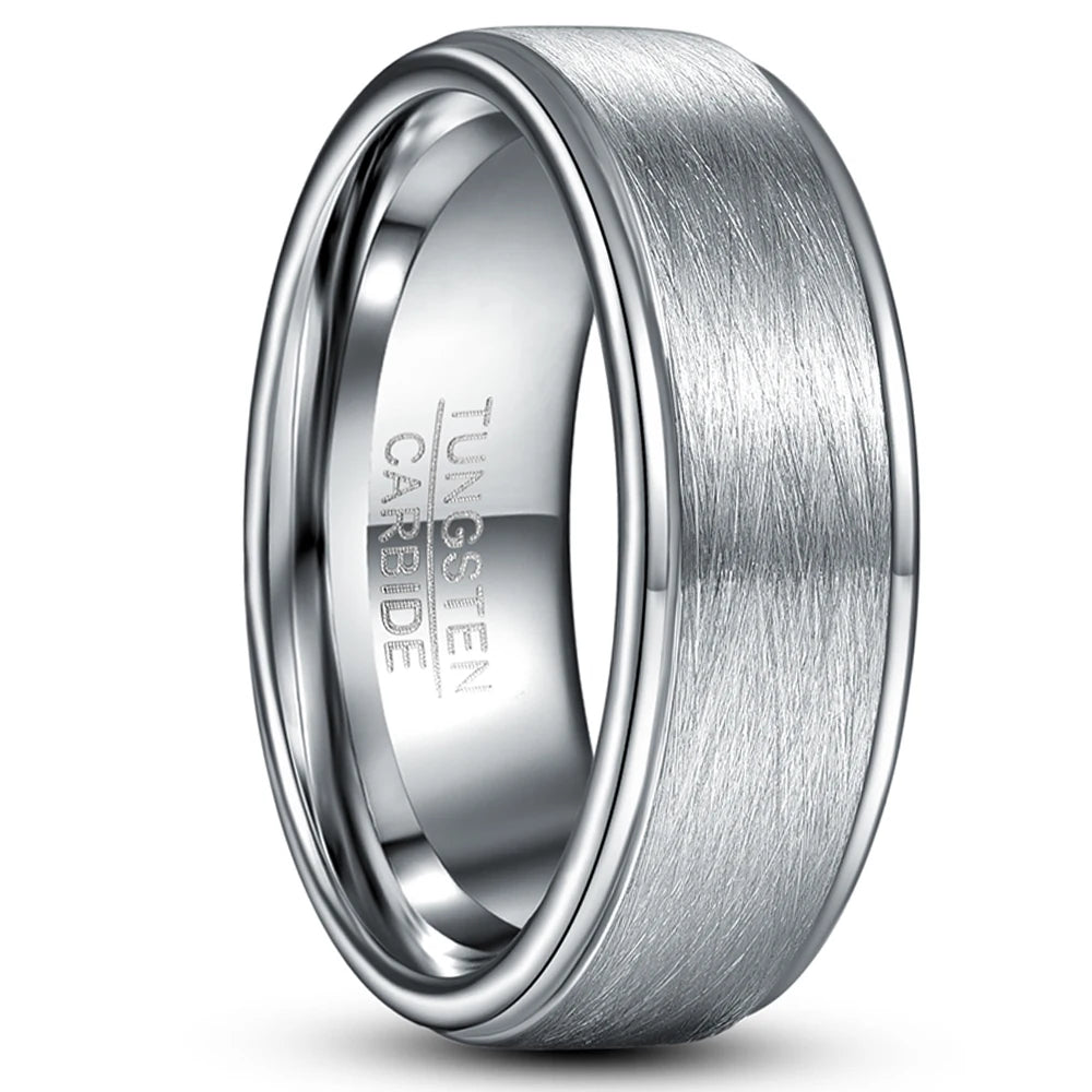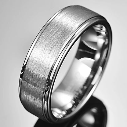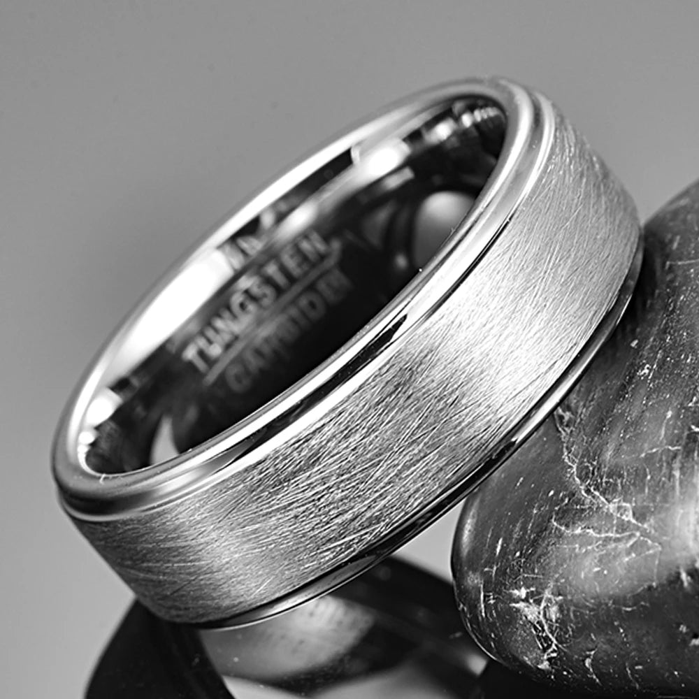 This Tungsten silver ring is expertly handcrafted from premium-grade silver Tungsten in an 8mm width, featuring a bold brushed exterior with polished stepped edges for a striking contrast. Designed for both durability and comfort, its contemporary look makes it a standout piece.