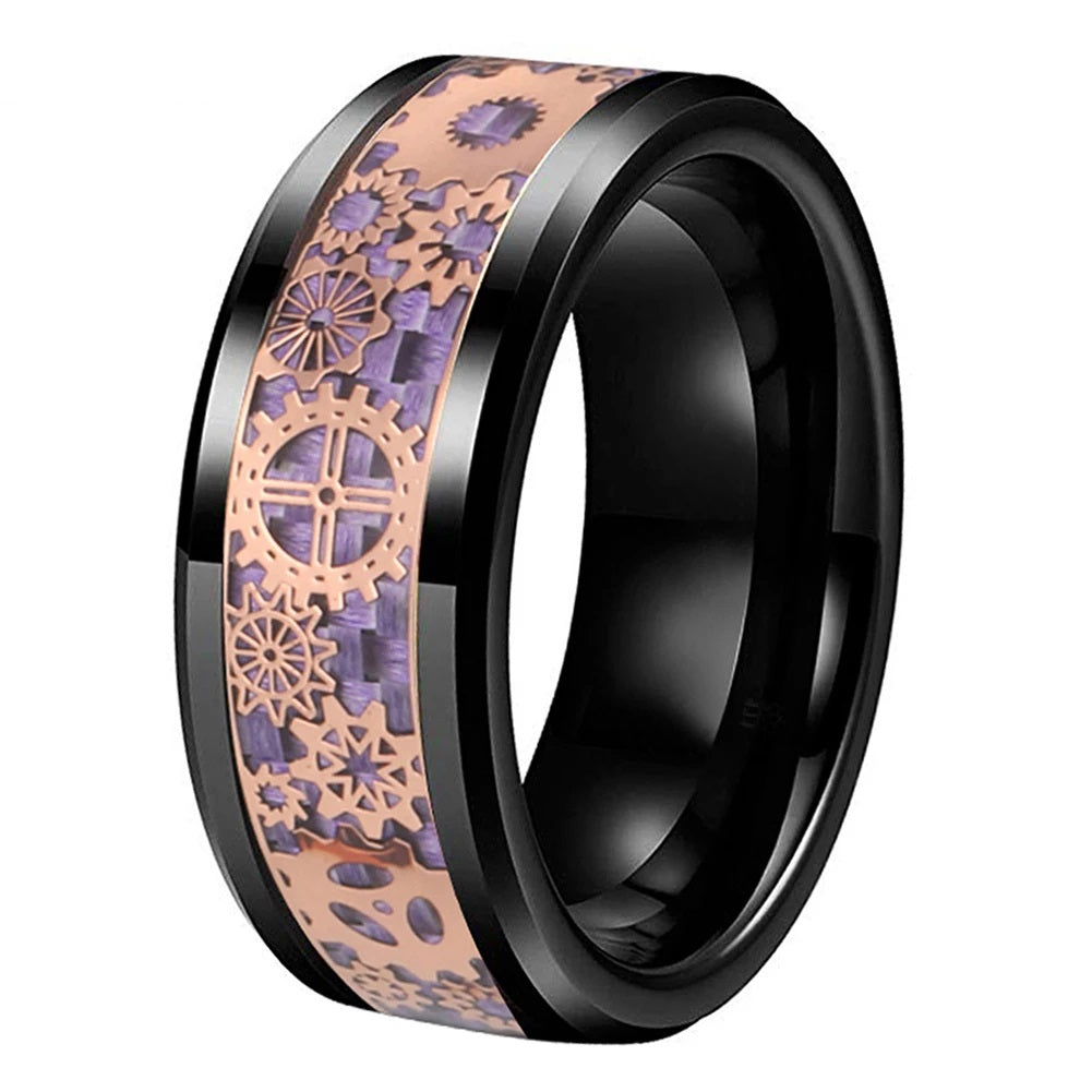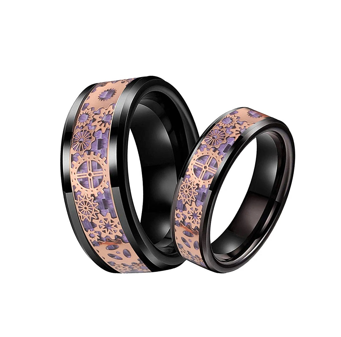 Steampunk wedding bands are more than metal—they are machinery made meaningful. At the core of this design lies a striking inlay of rose gold gears set against a field of violet carbon fiber. The contrast is electric: soft warmth meeting futuristic shimmer, like embers suspended in twilight. Every cog is precisely embedded, echoing the rhythm of invention and the constancy of time.