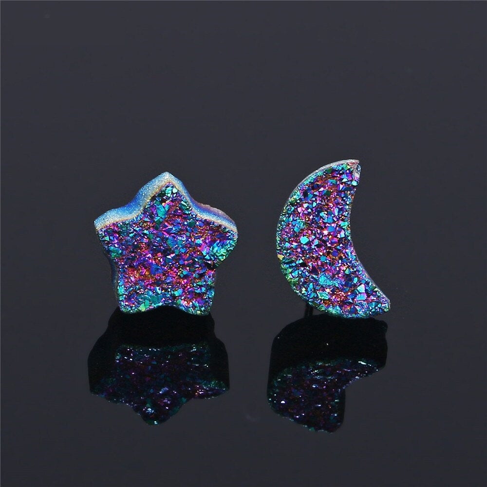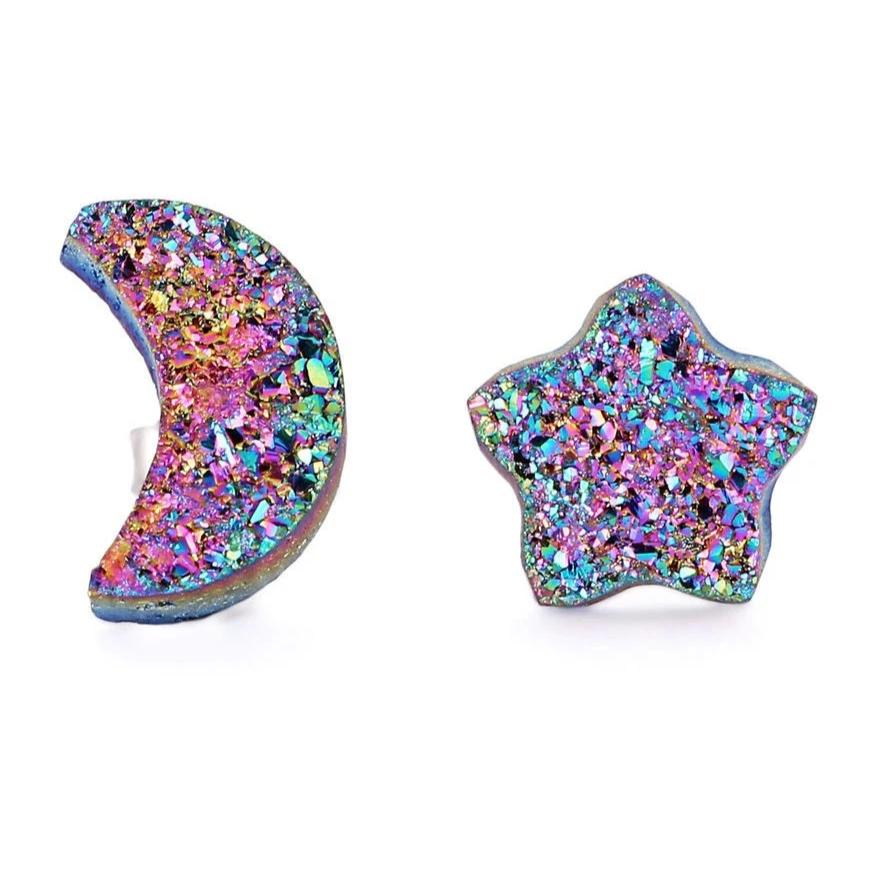 These gorgeous mismatched star and moon earrings are made from natural quartz druzy gemstones which have been treated with Titanium to give them a stunning metallic rainbow coloration. They sparkle beautifully in the light, and are sure to attract attention everywhere you go!